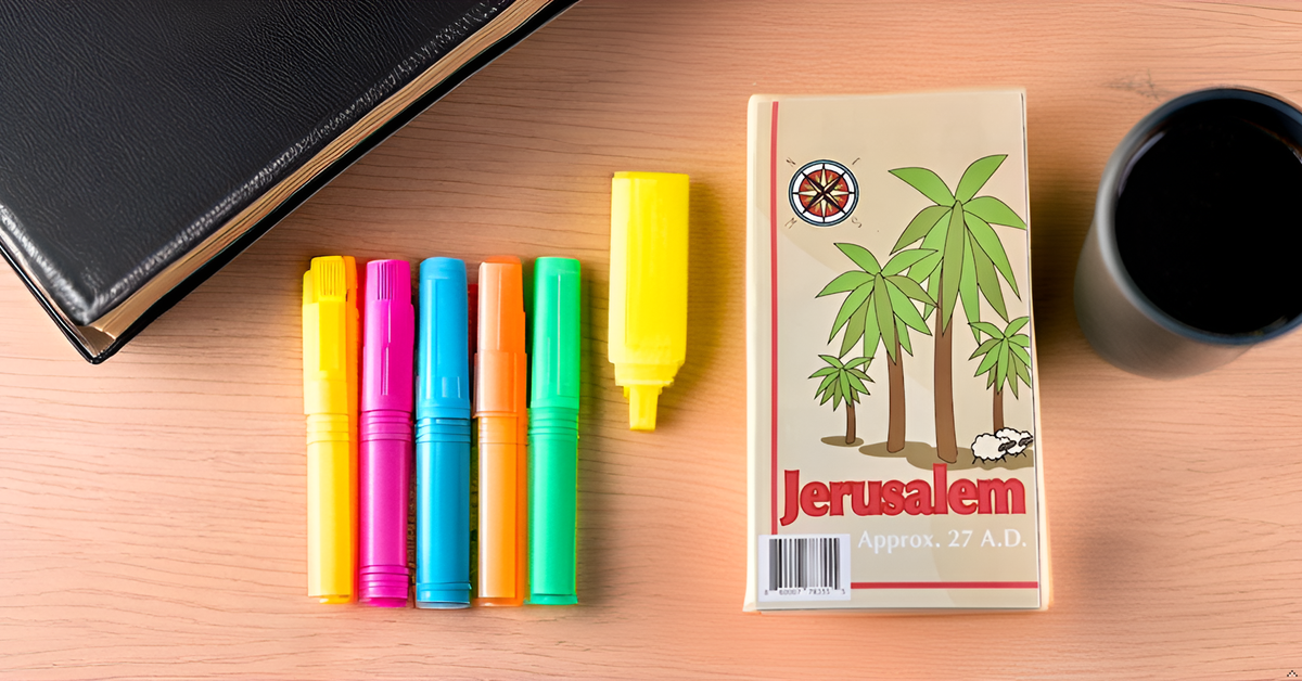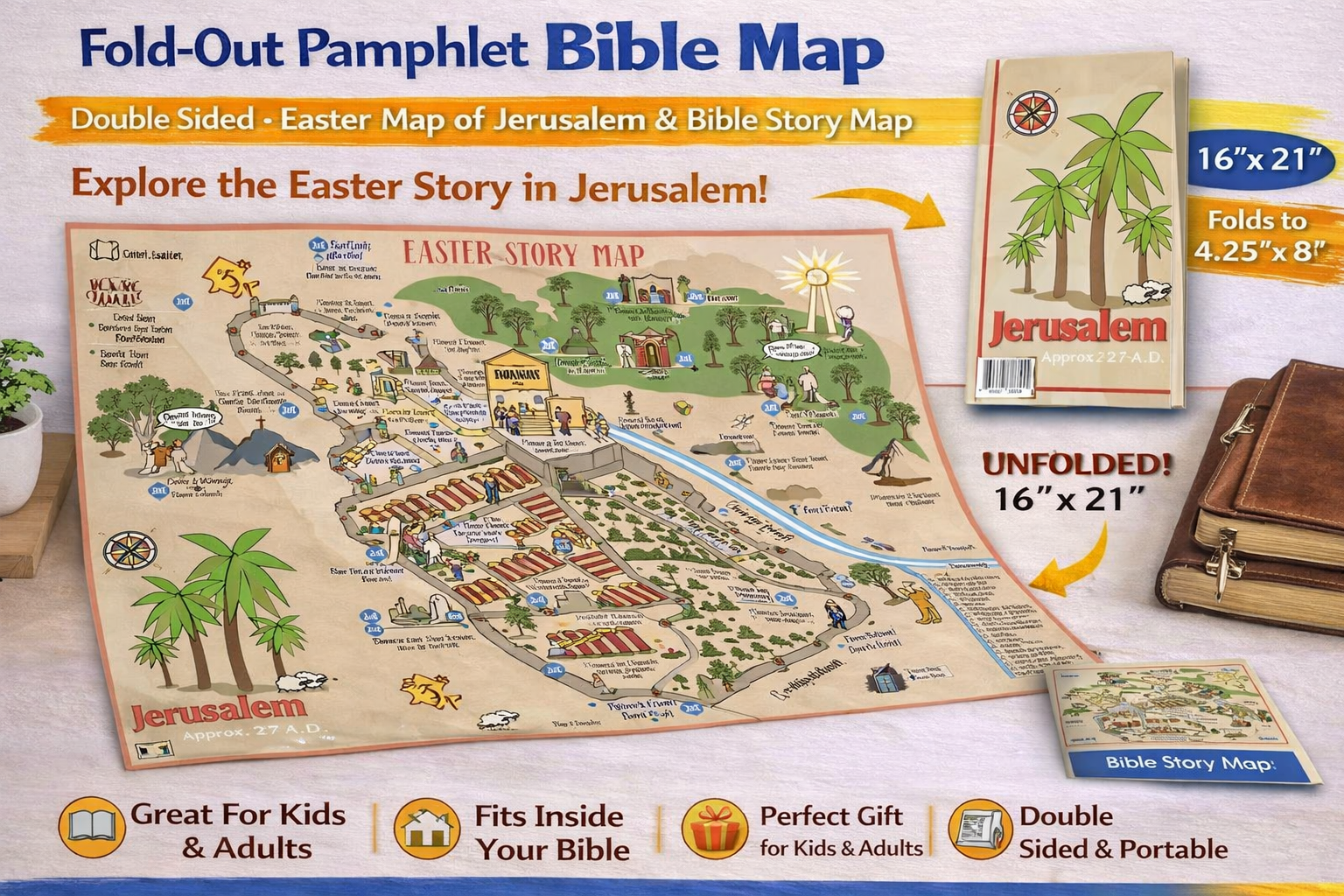 Fold Out Pamphlet Bible Map of Bible Story Locations and Easter Events in Jerusalem. Double Sided. 16" x 21" and folds to 4.25" x 8"