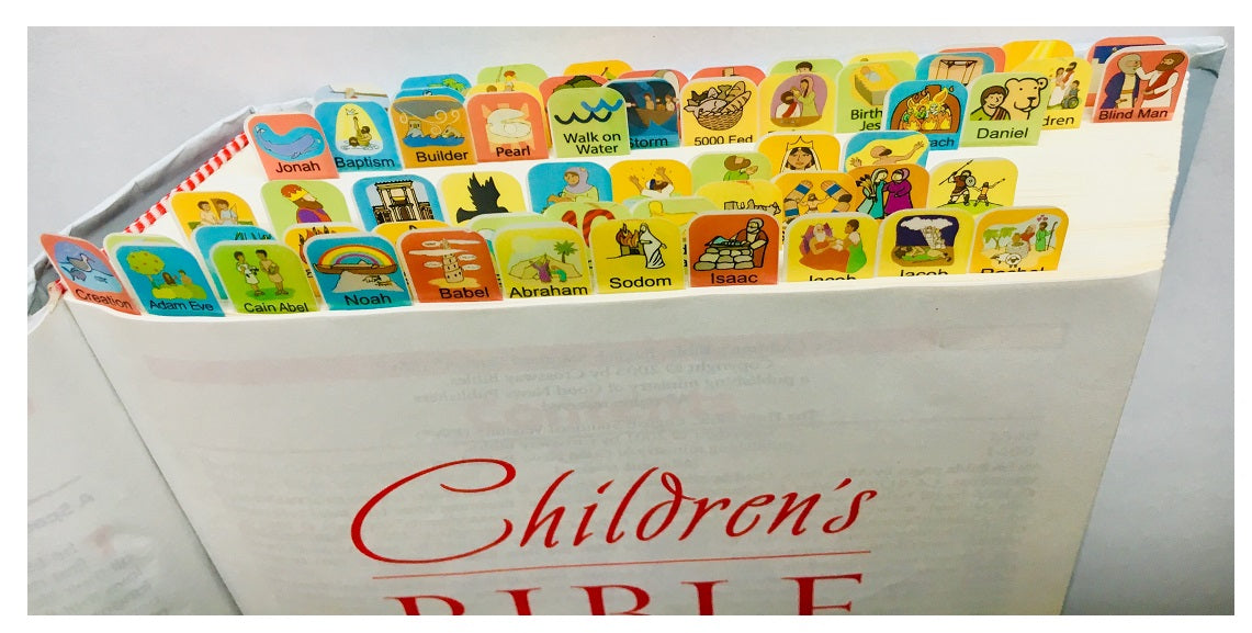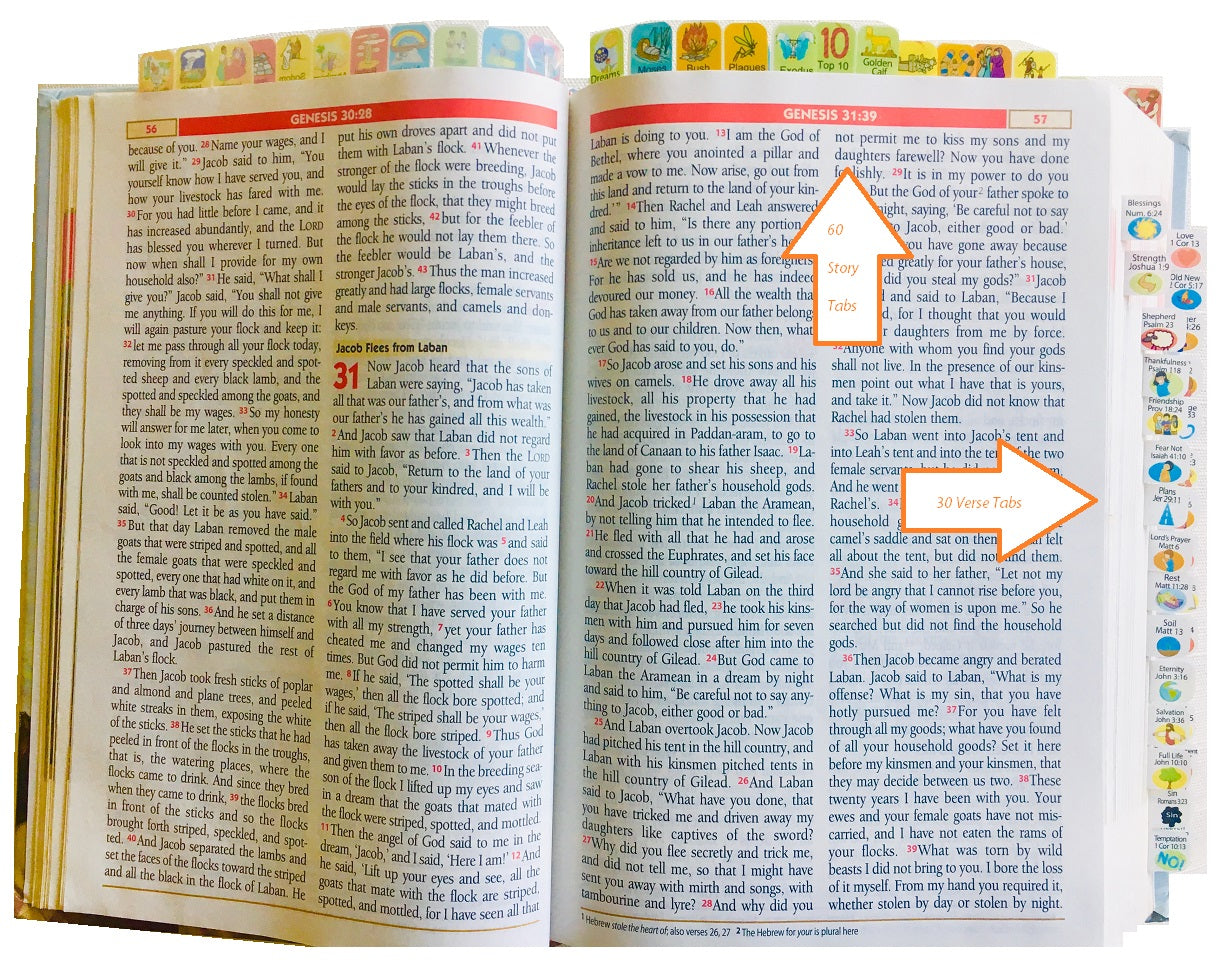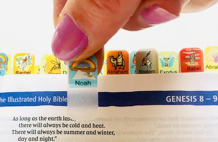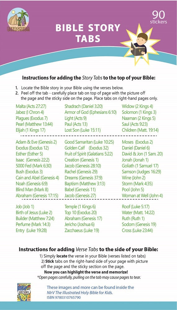 Bible Tab Set. Quickly find popular bible stories and bible verses! A set of 90 tabs to stick on your bible pages! Perfect gift for children and adults. A must have for anyone with a Bible. These new tabs make the Bible more user friendly and less intimidating. Includes 60 story tabs (David, Moses, Noah, Daniel, etc.) and 30 verse tabs (John 3:16, 1 Cor 13, etc.).